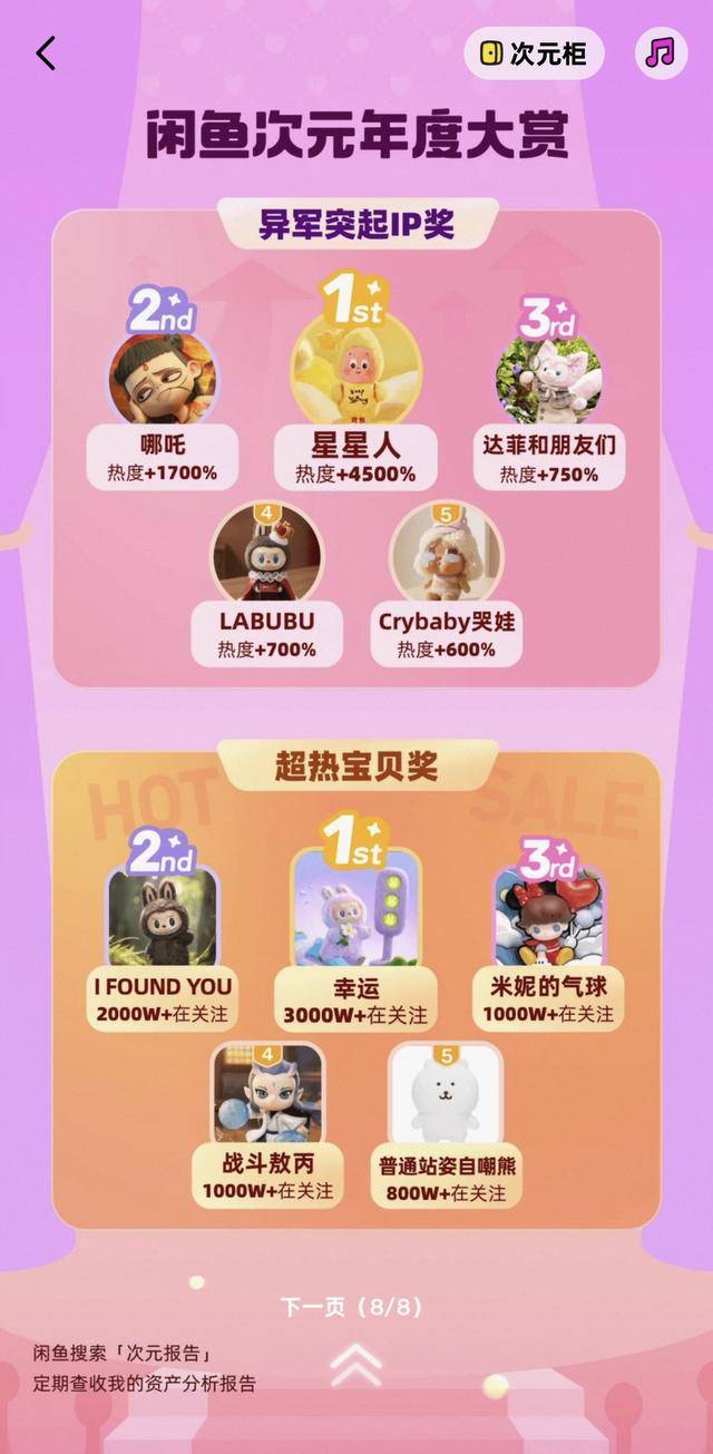 首届“闲鱼次元年度大赏”结果在报告中揭晓,直观反映了2025年二次元消费市场的潮流变迁。其中,星星人、