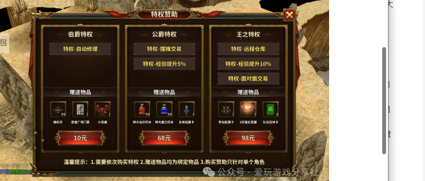 :激活68元公爵特权+10元伯爵特权(共78元),解锁自动修理、摆摊交易、背包扩容等基础功能,满足日常搬砖需求。