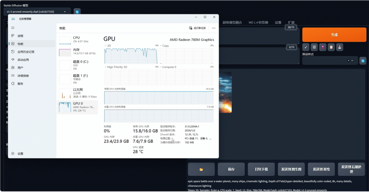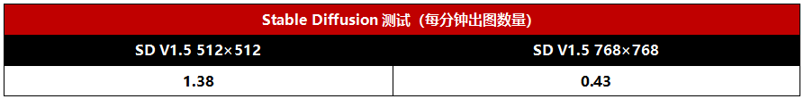 我们使用SD1.5模型进行出图测试,迭代步数为20、CFG为7、每批出图与批数皆为1,采样方式为Euler a,分辨率分别为512×512、768×768。可以看到,在512×512分辨率下,Radeon 780M大约每分钟出图1.38张,768×768分辨率下每分钟出图大约0.43张。这个速度其实已经是当前旗舰处理器出图速度的5倍~6倍了。最重要的是,由于显存可以分配得很大,Radeon 780M对高分辨率出图的支持度甚至好于一些只有4GB~6GB显存的独立显卡。