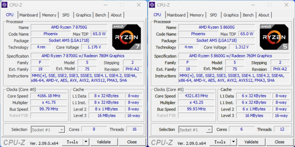 我们首发测评使用的,正是锐龙7 8700G和锐龙5 8600G这两款使用Zen4核心的零售主力。从CPU-Z信息可以看到,它们的核心代号为Phoenix,制造工艺为4nm,三级缓存都是16MB,相信关注锐龙7040系列移动处理器的朋友对此规格不会陌生。不过,值得一提的是,锐龙7 8700G内置的Radeon 780M核显频率高达2900MHz,锐龙5 8600G内置的Radeon 760M也高达2800MHz,显然比移动版的要高不少,再加上台式机处理器可以解锁功率墙并支持PBO和超频,这让我们对它们的性能有了更多的期待。