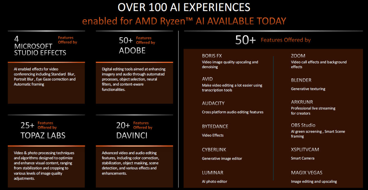 目前已经有超过100个AI应用或功能提供了对AMD Ryzen AI引擎的支持,包括4个微软工作室特效、超过50个Adobe软件功能、超过25个TOPAZ LABS软件功能、超过20个达芬奇软件功能和超过50个的各种主流生产力软件与功能。可见Ryzen AI的生态圈发展非常迅速,已经逐渐覆盖我们日常工作的应用范围。
