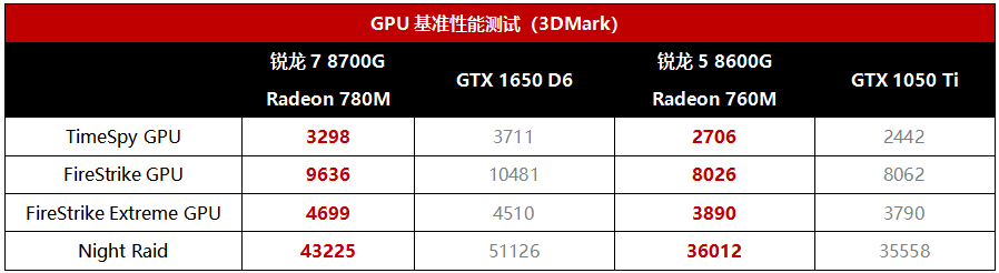 GPU基准测试部分,看起来GTX 1650 D6对Radeon 780M似乎有些优势,但大家从前面的游戏实战测试已经看到其实两者的实际体验是相当的,总体来说互有胜负,Radeon 780M在新游戏中的表现更好一些,甚至能大幅领先。Radeon 760M相对GTX 1050 Ti的基准分领先幅度看起来并不算特别大,但在前面的游戏实战中可以平均领先后者43%,可见基准分大家参考一下即可,游戏实际体验可能会大相径庭。