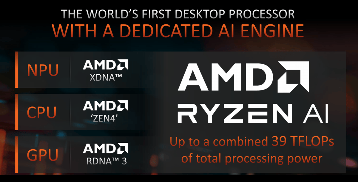 而锐龙8000G系列正是AMD布局桌面AI PC的第一步,这一次AMD又走在了业界前面。锐龙8000G系列与锐龙8040移动处理器一样,同时具备Ryzen AI引擎打造的NPU、Zen4架构处理器核心与RDNA3核显,而由于定位桌面平台,它的功率设定自然更加宽泛,整体的性能释放更加完全。根据AMD官方数据来看,锐龙8000G的整合计算能力高达39 TFLOPS。