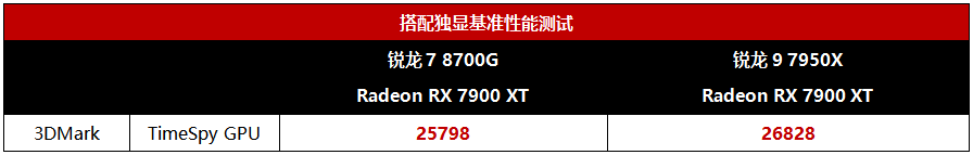 锐龙8000G除了内置强力核显之外当然也可以升级高端独显,这为核显用户也提供了不错的升级空间。可能有朋友关心锐龙8000G升级高端显卡会不会导致性能损失,对此我们进行了对比,同样搭载Radeon RX 7900 XT显卡的情况下,锐龙7 8700G平台的TimeSpy GPU得分大约是锐龙9 7950X平台的96%,所以大家尽管放心用锐龙8000G搭配高端显卡使用,基本上没有什么性能损失的。