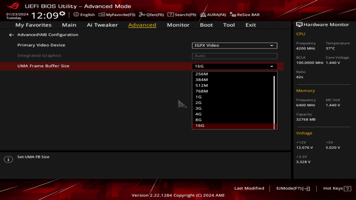 当然,RDNA3核显最大的看点还是支持Stable Diffusion出图,不但支持DirectML模式,还可以通过Olive优化模型以实现效率翻倍。特别值得一提的是,锐龙8000G的核显可以在主板BIOS中手动指定容量,在系统配备32GB内存的情况下,最高甚至可以分配16GB显存,更大的显存可以在Stable Diffusion中使用更高分辨率出图,这也是除了AMD核显独有的优势。