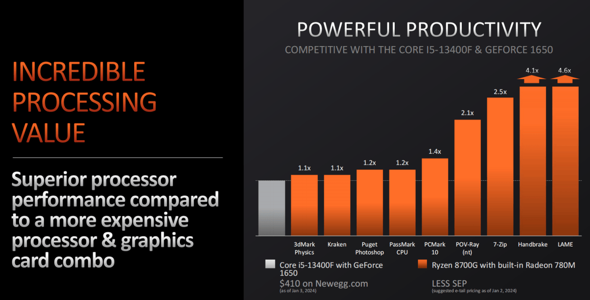 除了游戏之外,生产力方面锐龙7 8700G也十分强悍。从官方对比数据可以看到,在众多主流生产力工具中,锐龙7 8700G相对酷睿i5 13400F + GTX1650都有一定的优势,在吃多线程的生产力应用中,最大优势甚至高达360%。