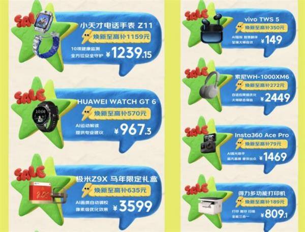除了核心的娱乐与办公设备,智能穿戴、影音影像及办公周边产品同样精彩纷呈。为孩子添置开学安全守护装备,小天才电线元,全方位安全守护;关注健康与时尚,HUAWEI WATCH GT6焕新至高补贴570元,到手价967.3元。影音爱好者不容错过:极米Z9X 马年限定礼盒投影仪焕新至高补贴635元,到手价3599元;vivo TWS 5耳机焕新至高补贴350元,到手价仅149元;索尼WH-1000XM6耳机焕新至高补272元,到手价2449元。记录生活精彩瞬间,Insta360 Ace Pro运动相机焕新至高补79元,到手价1469元。办公场景也考虑周到,得力多功能打印机焕新至高补189元,到手价809.1元,满足家庭或小型办公的打印需求。