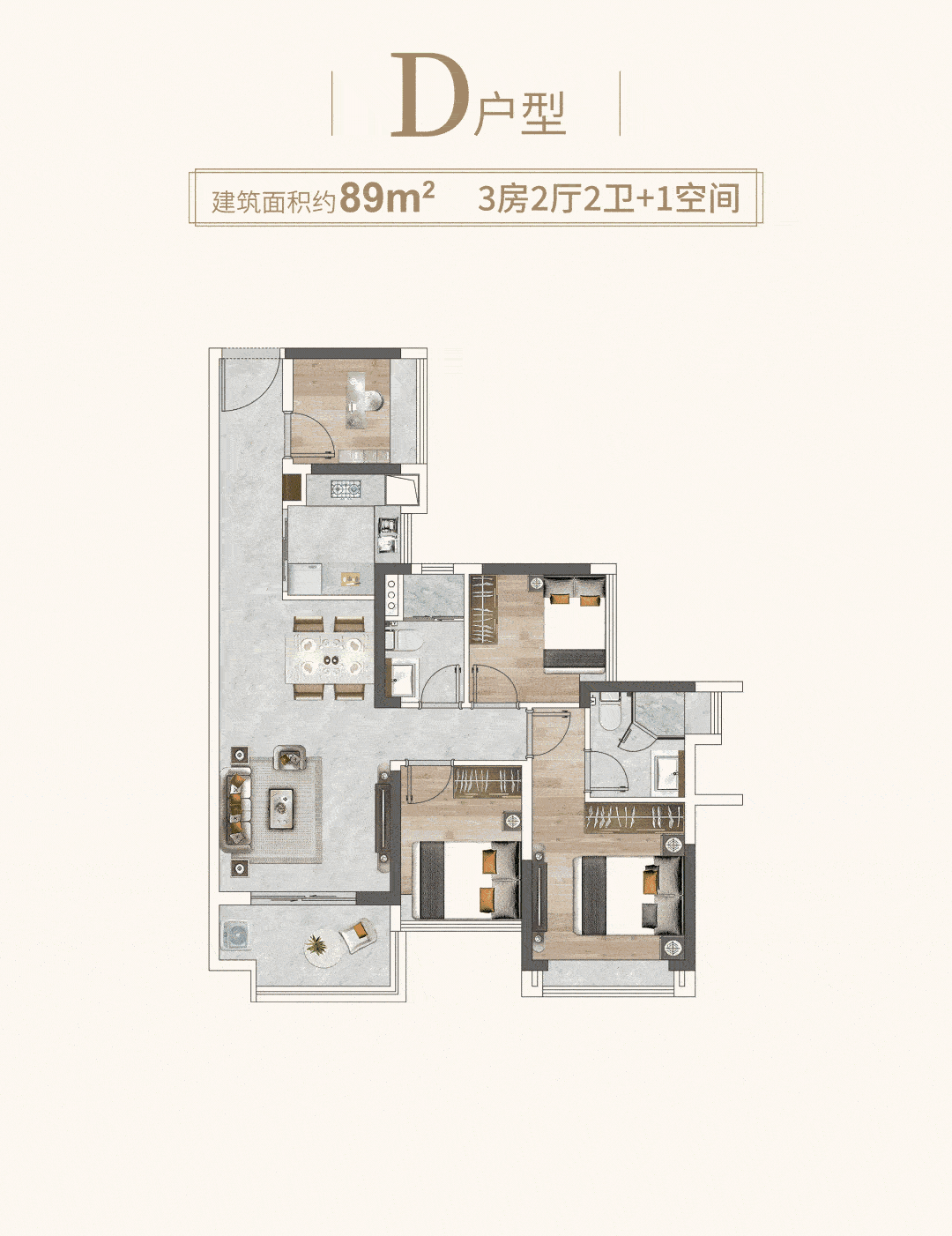 89平方米户型为3房2厅2卫+1空间,经典竖厅设计,空间动静分明,三开间朝南,引阳光清风入室,每一个房间都能享受充足采光。该户型客厅开间约3.6米,餐客分离设计,兼顾实用性与舒适度;主卧套房设计,配备独立卫浴和景观飘窗,尊享私密与舒适;次卧空间宽敞,可作为儿童房或父母房,灵活适配家庭需求;额外赠送1个灵活空间,可改造为书房、休闲室等,盛放生活雅趣。该户型得房率超90%,空间利用率高,三开间朝南的设计的让室内采光通风效果极佳,居住舒适度高,适合追求品质的刚需家庭。