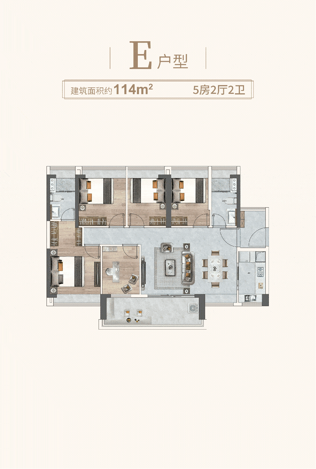 114平方米户型为5房2厅2卫,总价388-401万元,是项目改善型刚需户型,LDK一体化设计,宴客会宾彰显尊贵排场,客厅、餐厅、厨房相连,空间通透,互动性强,适合家庭聚会、宴客等场景;四开间朝南,阳光流连清风婉转,全屋采光充足,每一个房间都能享受阳光照射;巨幕宽景阳台,长度约5.5米,宽度约1.8米,俯仰天地美景入怀,可打造休闲区、种植区等,满足业主休闲需求;舒适双卫设计,主卧配备独立卫浴,公共卫浴干湿分离,生活起居从容有度,避免早晚高峰拥挤。该户型做到5房设计,适配多子女家庭或三代同堂家庭,空间宽敞,布局合理,得房率超90%,是刚需家庭改善居住的优选。