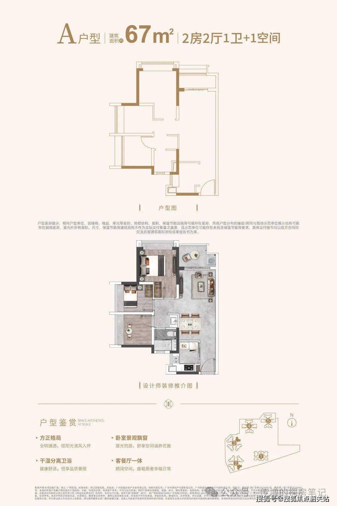 67平方米户型为2房2厅1卫+1空间,总价215-220万元,东南向布局,全明通透,揽阳光清风入怀,全屋无暗区,每一个空间都能充分利用。该户型餐客一体设计,客厅开间约3.2米,连接景观阳台,提升空间通透感和采光效果;主卧带景观飘窗,采光充足,视野开阔,可作为休息、休闲空间;额外赠送1个灵活空间,可根据业主需求改造为书房、儿童房、储藏室等,满足多元生活需求。该户型紧凑实用,总价低,首付38万元起,是刚需人群上车的优选户型,同时做到全明通透,居住舒适度较高,无需担心空间拥挤。
