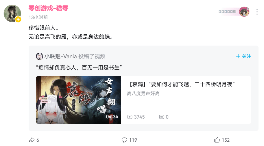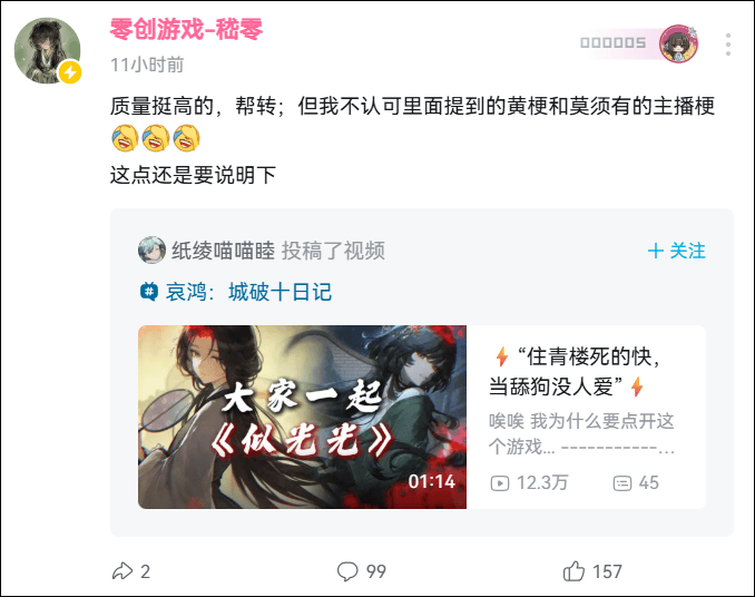 相比其他制作人,嵇零明显站的要与玩家更近。他自己的看法也是这样,相比推广,黑红流量,他其实更希望作品靠二创的方式传播,所以点开他的B站主页,会发现即使现在他被玩家骂的狗血淋头,但他依然转发各种二创,随便谈谈自己的看法,其中也包括了攻击他的杂谈。
