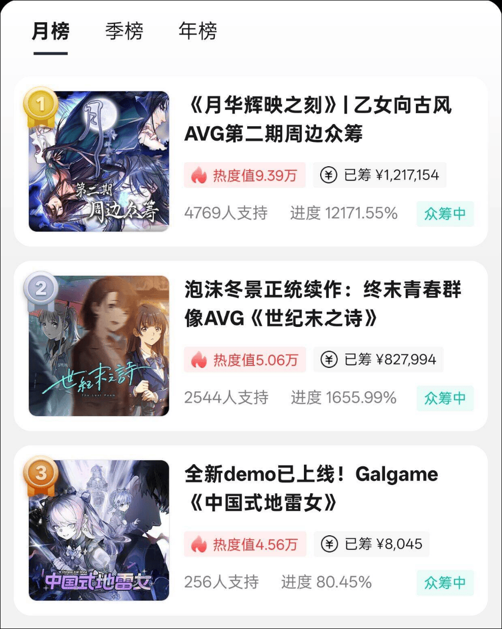 现在打开摩点的游戏栏,依然能看到不少AVG游戏的众筹页面,包括《泡沫冬景》的正统续作《世纪末之诗》,以地雷女卫题材的《中国式地雷女》。某种意义上,摩点上的AVG众筹,基本等于预售。