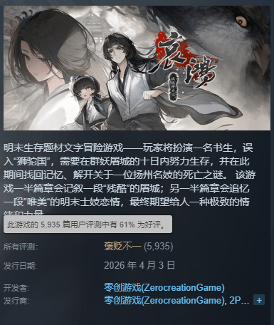 从口碑上,61%的好评率在玩家眼中,毫无疑问,完全的滑铁卢。但是从销量上,哀鸿首周销量破10万,在没有计算众筹的情况下,也已经回本,它可能没有饿殍成功,不似饿殍里程碑,但也很难说这部充满个人风格的文字冒险游戏完全失败。