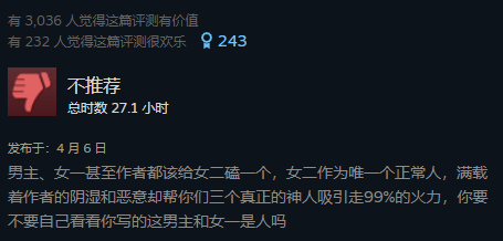 4月3日,游戏正式发售,当日好评率为93%,彼时还没有多少人通关这款游戏,大多数评价都来源于原作粉丝。可与“好评如潮”的商店页面相对照的,却是社交平台上,围绕女二号林翩翩“娼妓”设定展开的大量声讨。